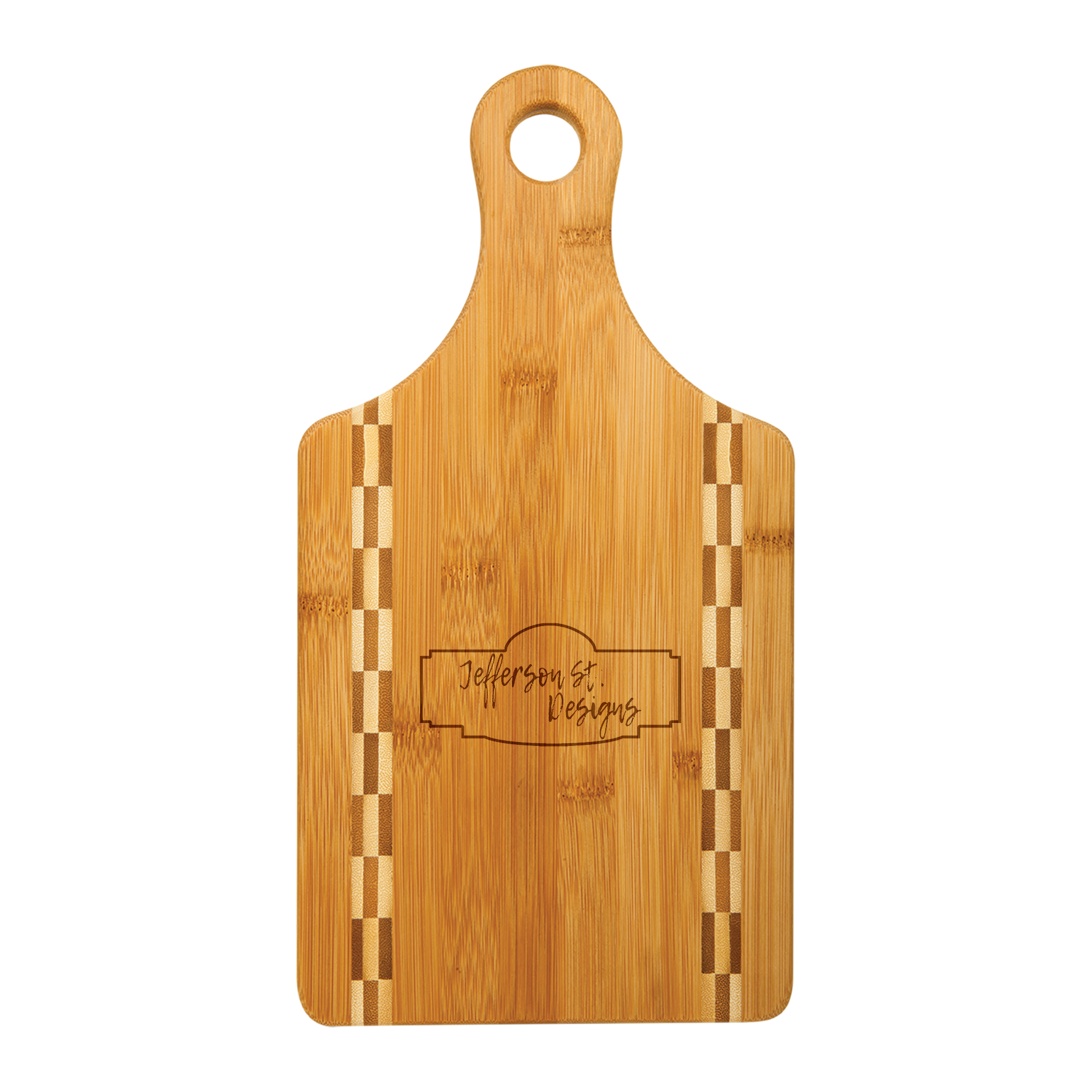 Choose Options Personalized Script Name - Bamboo Cutting Board with Butcher Block Inlay MSRP: Was: Now: $13.50 Beautifully crafted natural bamboo cutting board with butcher block inlay. Your custom design w…